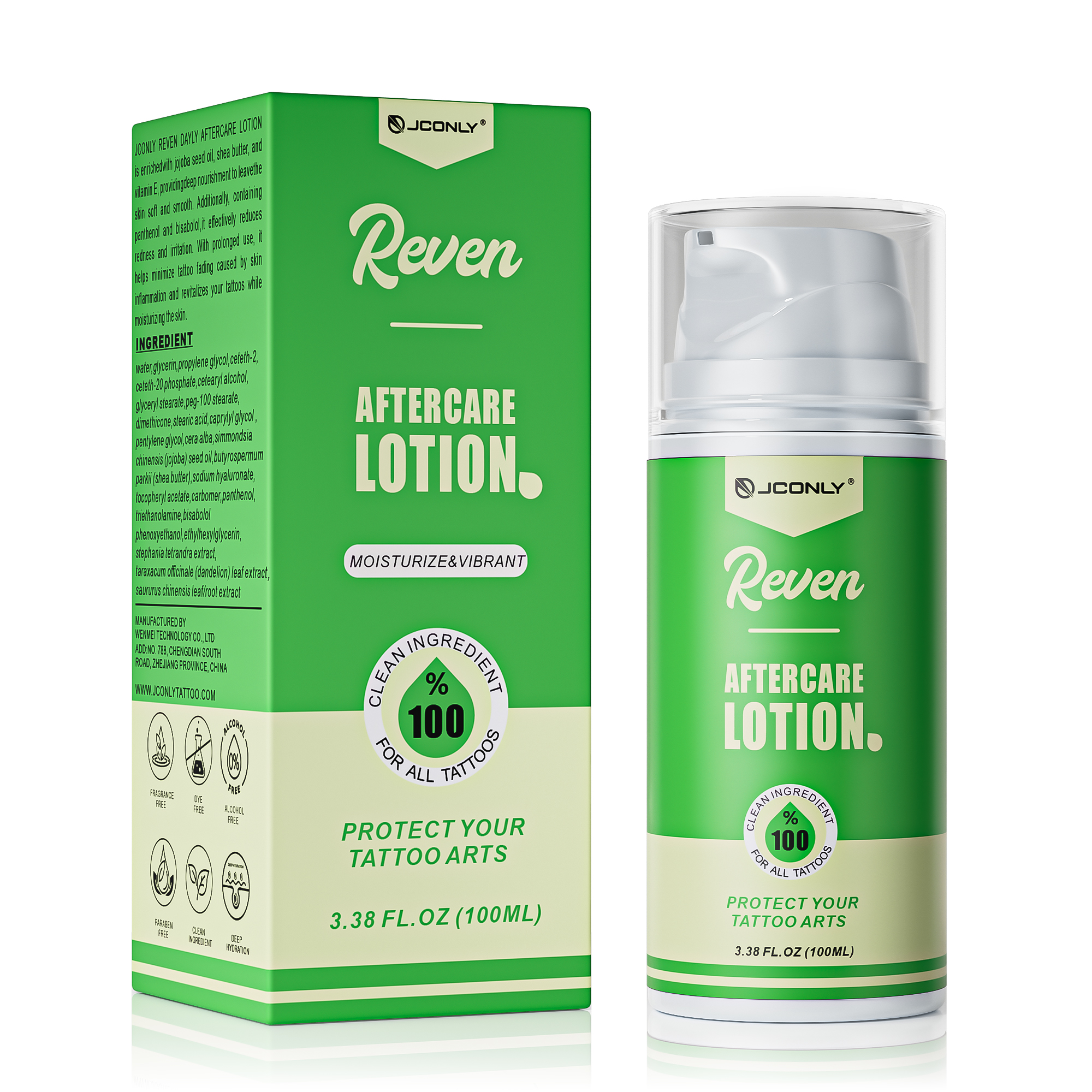 JCONLY REVEN Daily Aftercare Lotion is enrichdwith jojoba seed oil, shea butter, and vitamin E, providing deep nourishment to leave the skin soft and smooth. Addtionally, containing pathenol and bisabolol, it effectilvelly reduces redness and irritation. With prolonged use. it helps minimize tattoo fading caused by skin infammation and revitalizes your tattoos while moisturizing the skin.