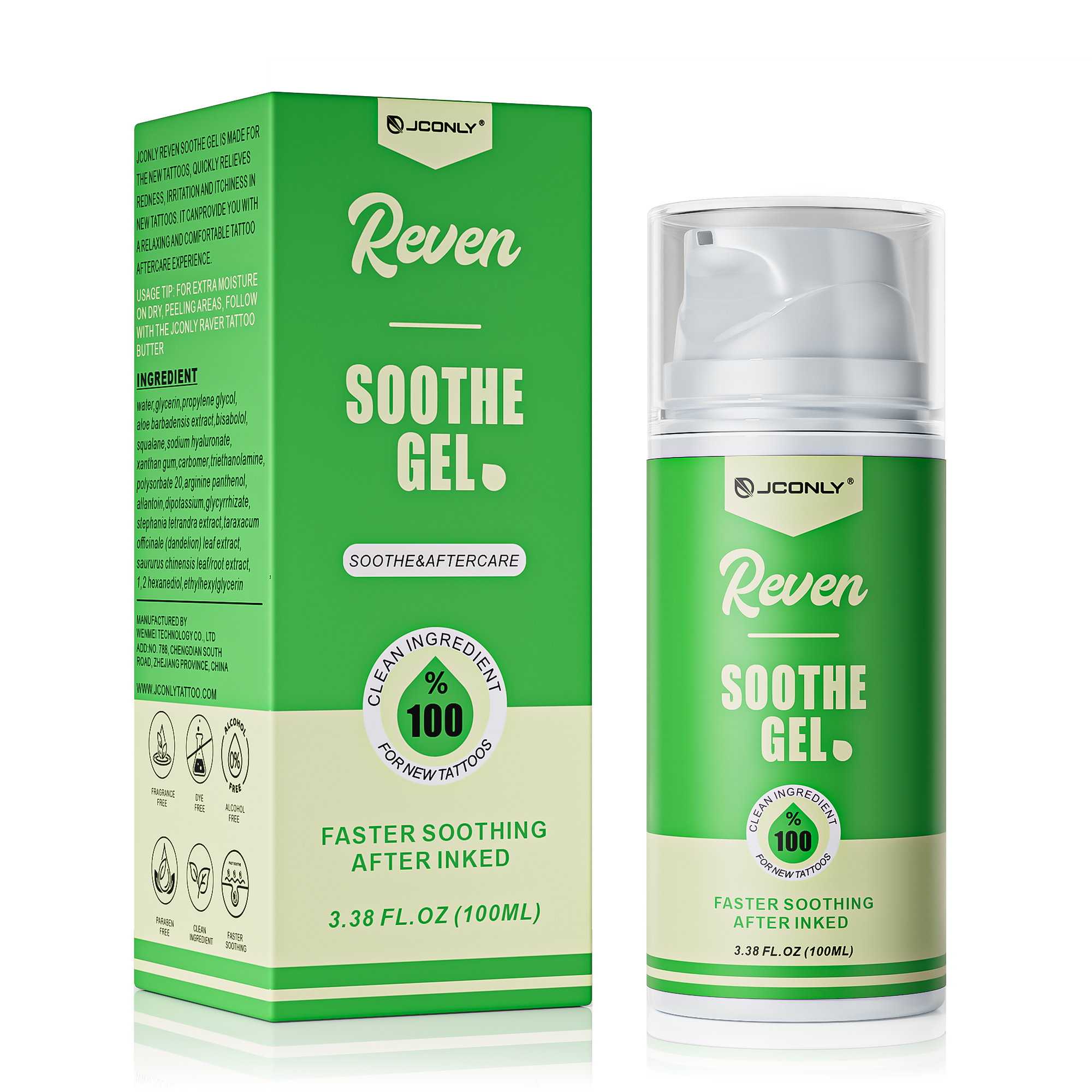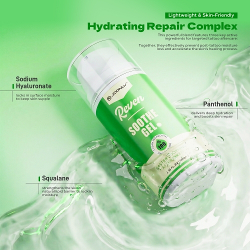 JCONLY REVEN Soothing Gel is specially designed for new tattoos, quickly relieving redness, swelling, irritation, and itching, providing relaxing and comfortable tattoo after care experience. It also helps maintain skin moisture and promotes healing. The gentle formula is suitable for all skin types. Aloe vera, panthenol, allantoin, and bisabolol work synergistically to soothe damaged skin and promote natural healing. Moisturizing ingredients such as hyaluronic acid and squalane help maintain the skin's moisture balance, keeping it soft, comfortable, and nourished during the tattoo healing process.